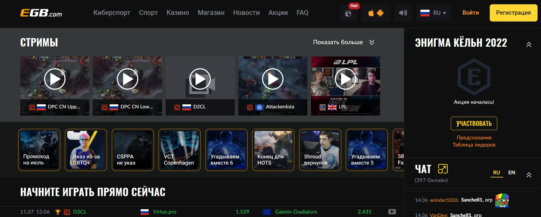 Беттинг платформа Еgb com является специализированной киберспортивной площадкой, где игрокам представлен обширный выбор кибер дисциплин и акцентировано внимание именно на ставках по е спорту. Кроме этого, оператор предоставляет возможность зарегистрированным пользователям заключать спортивные пари на традиционные виды спорта, а также весело и прибыльно проводить время в онлайн казино.
