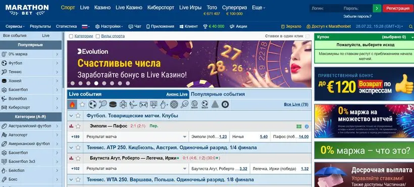 Беттинг платформа MarathonBet является известной и уважаемой компанией, которая более двадцати пяти лет уверенно входит в топ лучших спортивных операторов. Онлайн букмекер известен как большим ассортиментом направлений в традиционном спорте, так и наличием специализированного блока для киберспортивных пари. Кроме этого, на сайте компании есть онлайн казино, огромная коллекция слотов, игры с живыми дилерами, виртуальный спорт, финставки и даже тотализатор.